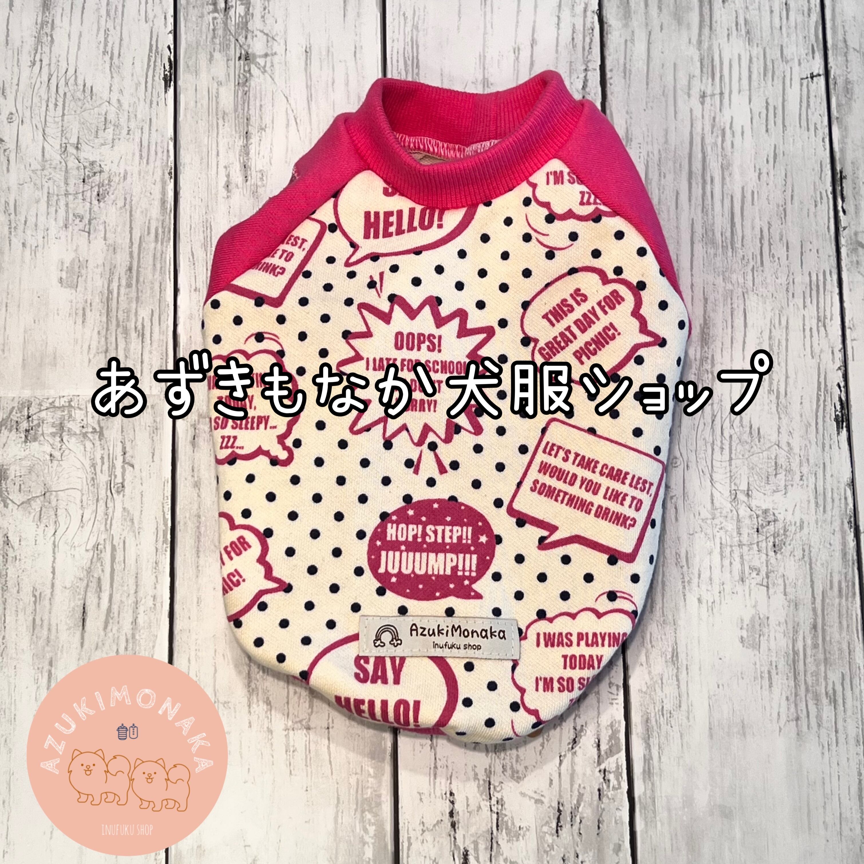 ふわっとした心地よい水玉柄のトレーナー生地に、かわいらしいピンクの吹き出しが描かれています