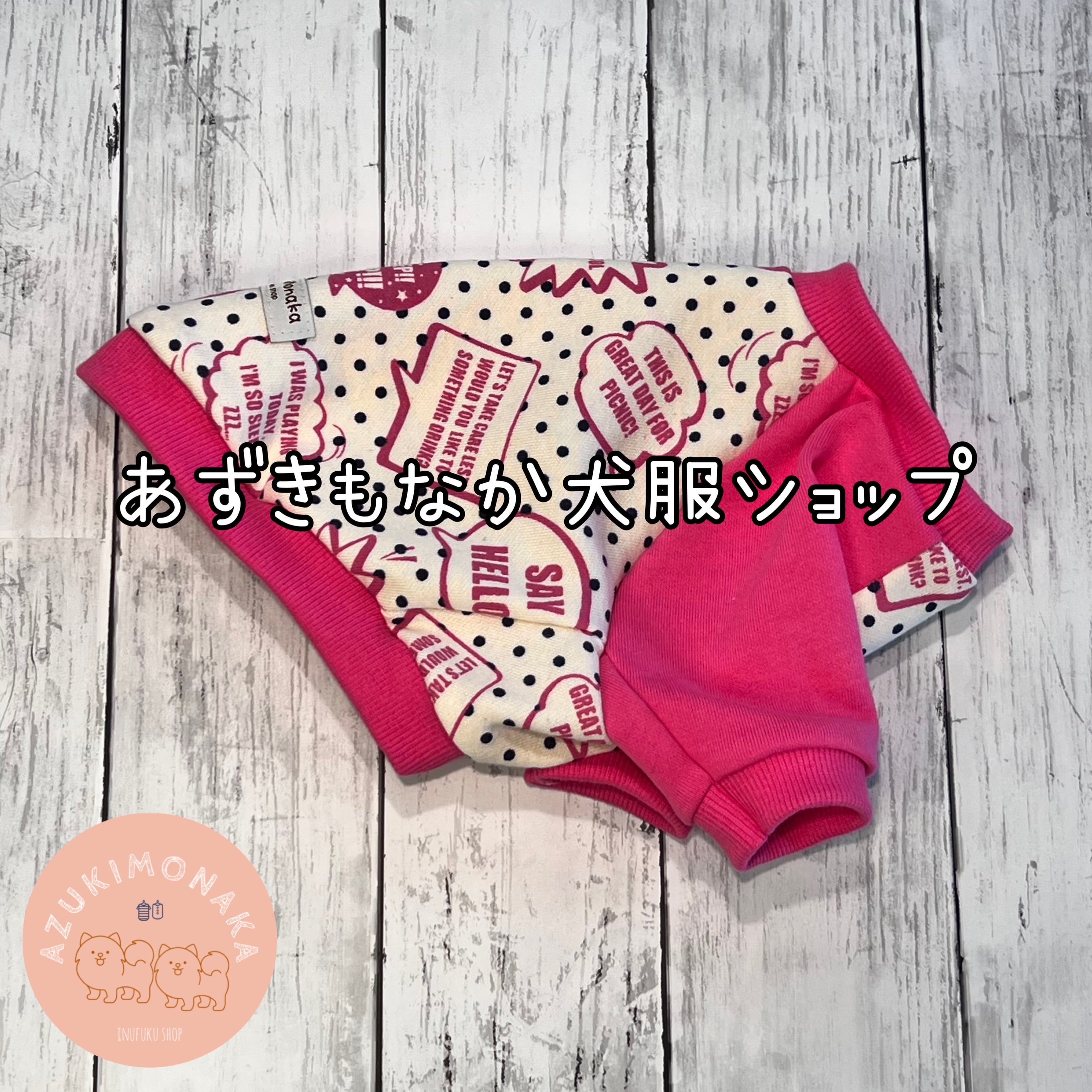 ふわっとした心地よい水玉柄のトレーナー生地に、かわいらしいピンクの吹き出しが描かれています