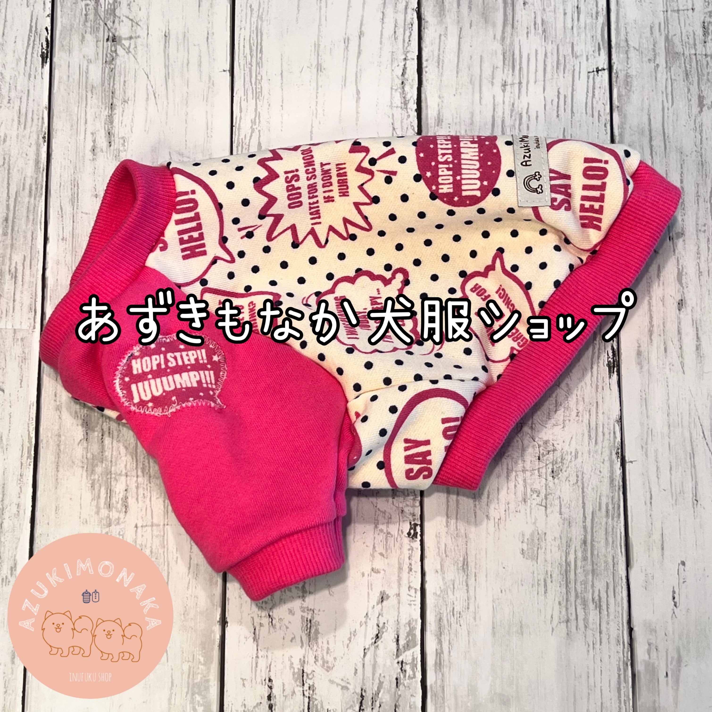 ふわっとした心地よい水玉柄のトレーナー生地に、かわいらしいピンクの吹き出しが描かれています